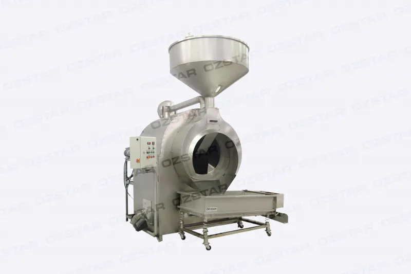 Эта стандартная направляемая обжарочная машина является усовершенствованной версией традиционных направляемых печей и ранних одноступенчатых барабанных ростеров. Она специально разработана для сушки и обжарки орехов и семян и оснащена одним двухступенчатым горелочным устройством, обеспечивающим низкий уровень выбросов NOx, высокое качество обжарки и превосходный вкус. Машина сконструирована таким образом, чтобы сохранять полный ароматический и вкусовой профиль продукта даже при высоких температурах, и использует метод обжарки горячим воздухом. Наличие двух корзин (одной перфорированной и одной неперфорированной) облегчает выгрузку готового продукта за счёт перемещения корзины к центру барабана. Кроме того, машина поддерживает солевую обжарку, при которой соль используется как косвенный теплоноситель для защиты продукта от повреждений, вызванных центробежной силой; готовый продукт затем извлекается с помощью перфорированной корзины.